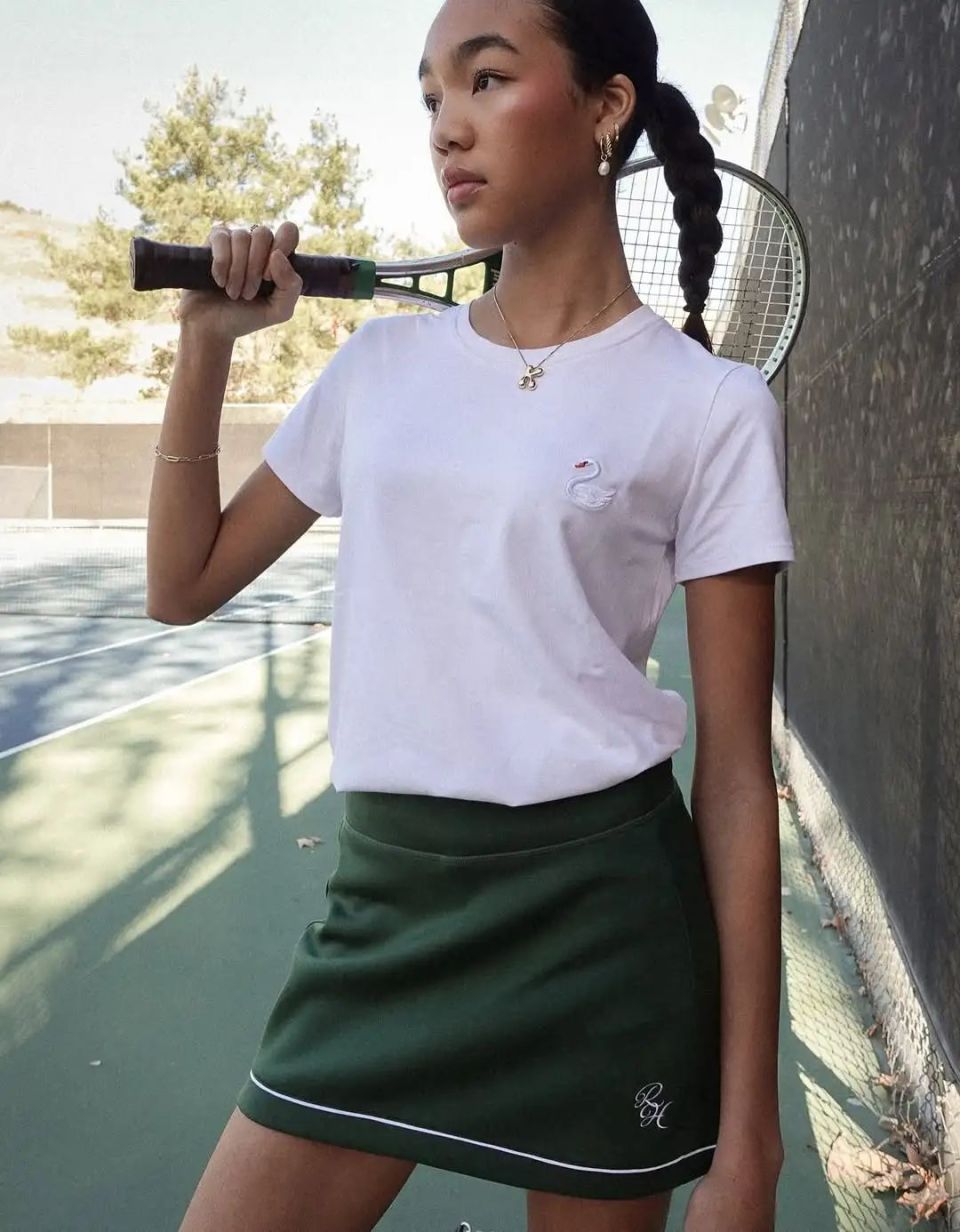 而她所穿的白色T恤、风琴褶网球裙、训练鞋,都来自lululemon夏日系列。她还别出心裁,叠穿了一件幻彩混色的工字背心,虽然变得没那么符合“纯白规则”,却给人一眼沁凉的清爽感。
