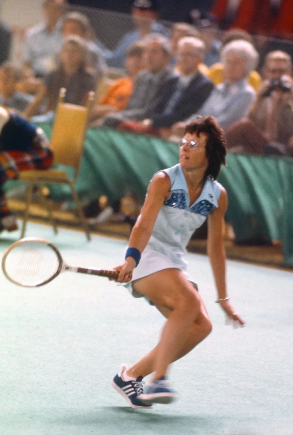 1973年,Billie Jean King在与Bobby Riggs的“性别之战”中,穿着Ted Tinling设计的蓝色拼接网球裙